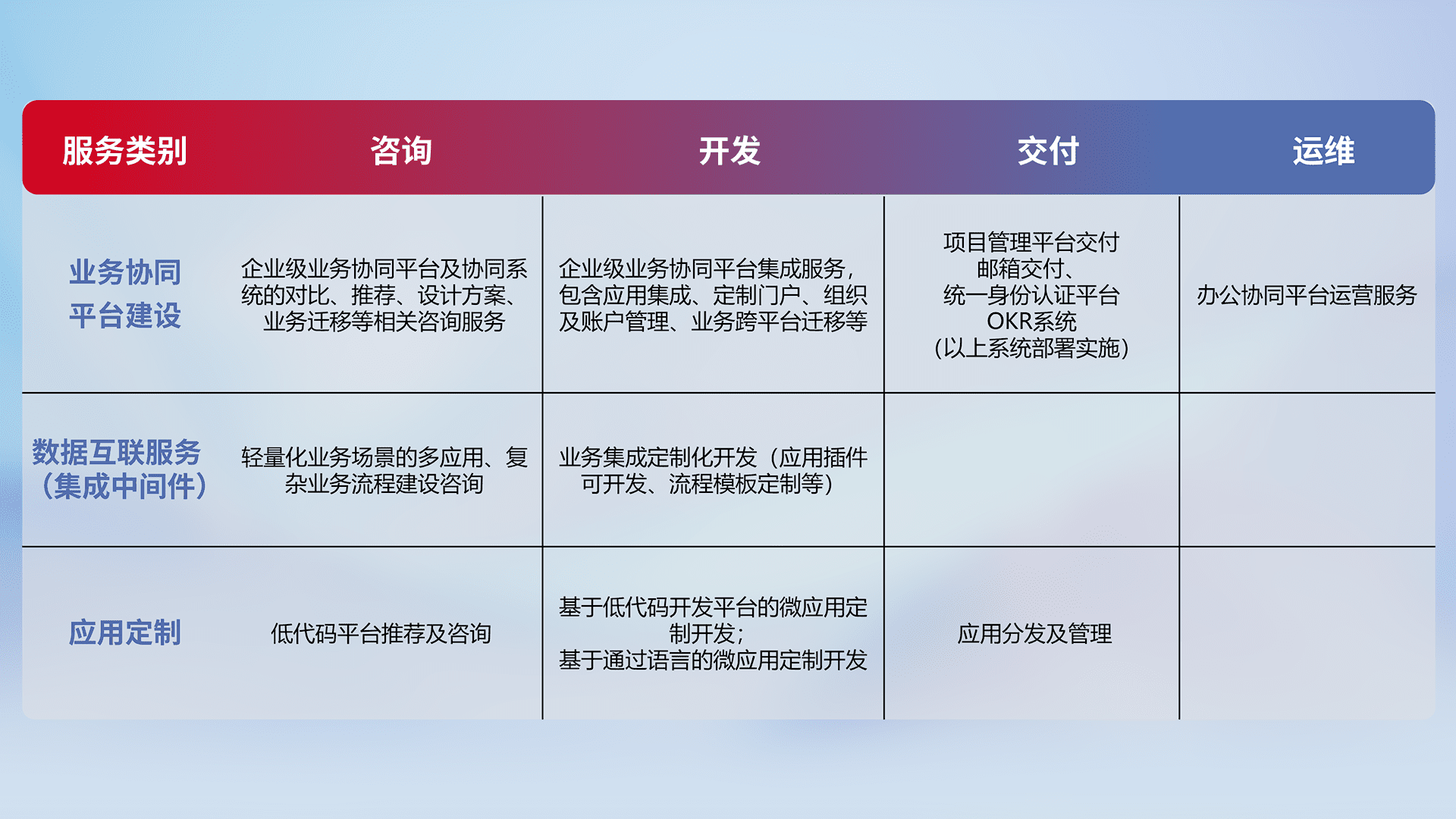 针对钉钉、、、企微、、、IDaas等平台级产品提供产品的规划、、、方案、、、交付、、定制化开发等服务,,实现如统一协同办公、、、、智能客户服务、、、混合会议管理、、、、智能数据查询、、、等业务场景,,,,实现数字化转型。。。